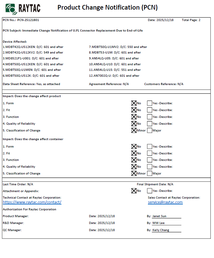 Immediate Raytac Product Change Notice (PCN-25121801) Announcement on u.FL Connector Replacement