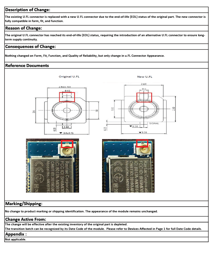There are no changes on Form, Fit, Function, and Quality of Reliability. Only change in u.FL Connector Appearance. All existing certifications and technical documentations remain valid.