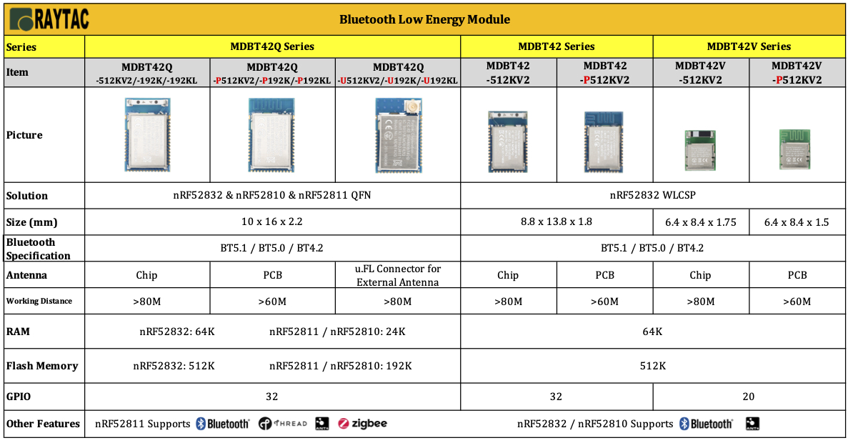 Raytac nRF52832 module spectrum covers MDBT42Q, MDBT42 and MDBT42V series with both Chip Antenna and PCB Antenna option for selection.