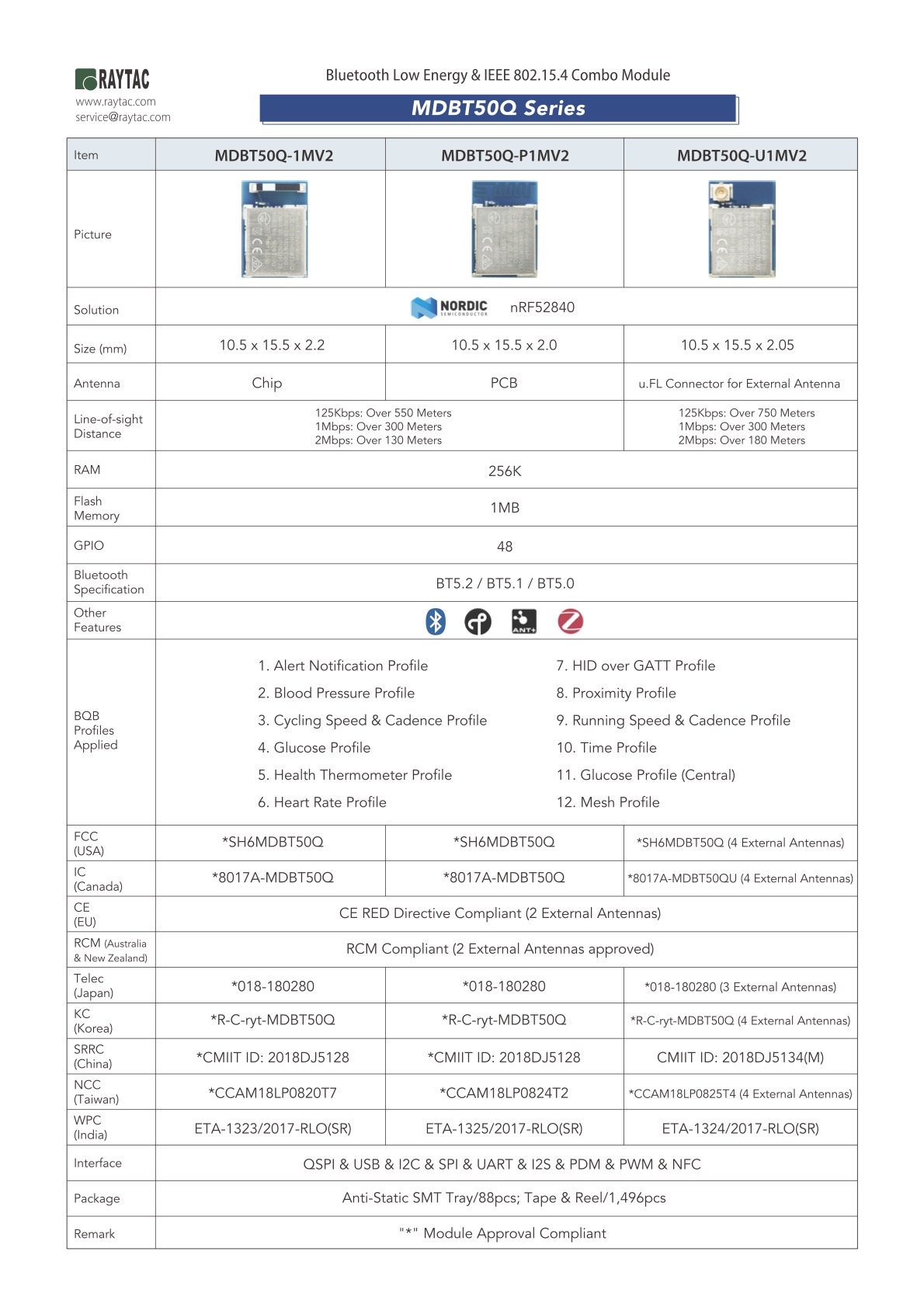 Raytac's MDBT50Q & MDBT50Q-P is a BT5.4 & BT5.2 & BT5.1 stack (Bluetooth low energy or BLE) module designed based on Nordic nRF52840 SoC solution, which incorporates: GPIO, SPI, UART,I2C, I2S, PMD, PWM, ADC, NFC and USB interfaces for connecting peripherals and sensors.
